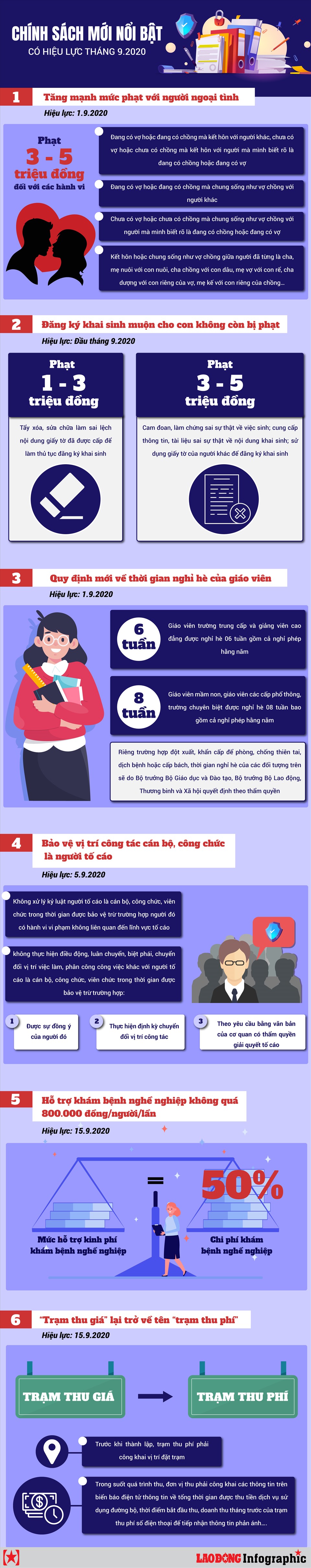 (LDO)- Tăng mạnh mức phạt với người ngoại tình; Đăng ký khai sinh muộn cho con không còn bị phạt;... là một trong những chính sách nổi bật có hiệu lực từ tháng 9.2020.